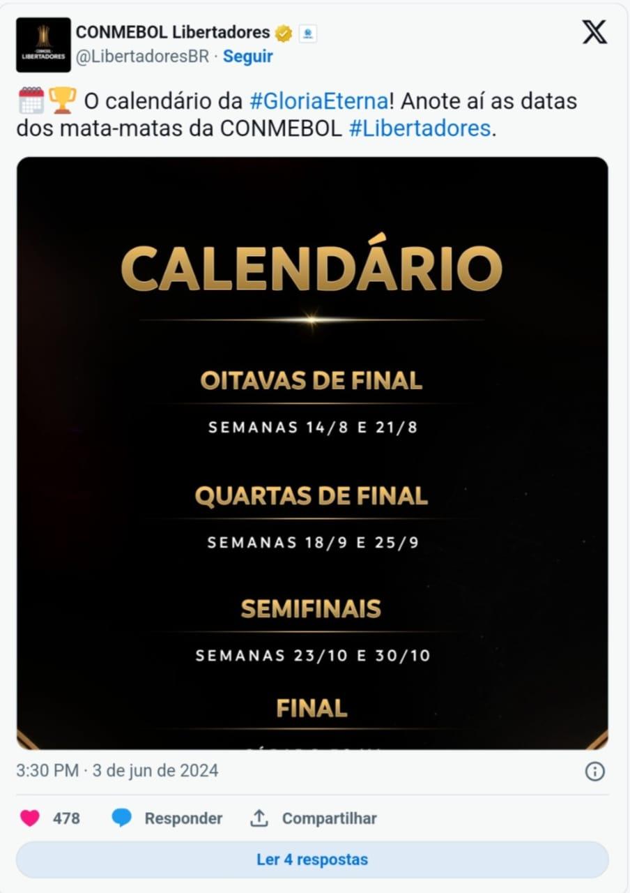 As partidas das oitavas de final da Copa Libertadores serão disputados nas semanas dos dias 14 e 21 de agosto. As quartas de final serão realizadas nas semanas de 18 e 25 de setembro. As semifinais estão programadas para as semanas dos dias 23 e 30 de outubro. E a grande decisão está marcada para o dia 30 de novembro, em Buenos Aires (Argentina).