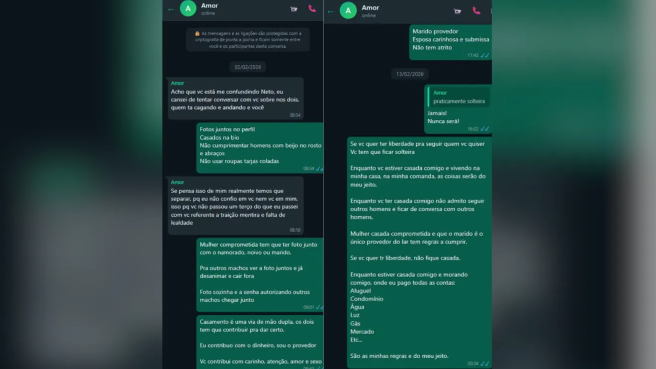 Em diversas mensagens, Gisele relatava que o marido monitorava suas redes sociais e que teria apagado perfis masculinos de suas contas.